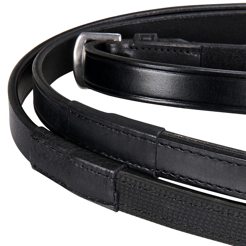Equestro Zaum Dressurreit, italienischen Leder mit glatter Stirnband. Dressur Zaum in echtem Leder, breite Nasenriemen und Riemenverschluss, Modell mit kontrastierenden weißen trimmen. Komplett mit Doppelzügel im Klarglattleder mit Schnallen aus Edelstahl.