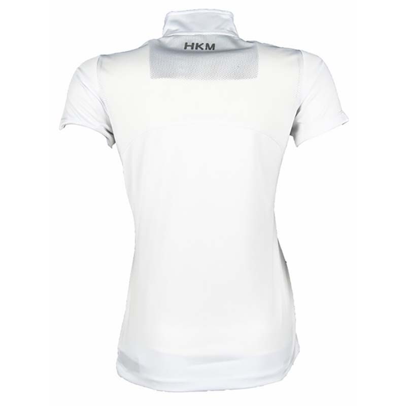 Mädchen High Performance Model Reitwettkampf Polo. Junge weibliche Reiter zeigen Polo-Shirt, mit kurzen Ärmeln, ausgestellt in der Taille, mit geradem Kragen, Reißverschluss, aus hoch atmungsaktiv und Feuchtigkeit absorbierenden elastischen Stoff, einfach zu pflegen und schnell trocken. 100% Polyestergewebe, maschinenwaschbar bei 30 Grad, trocknergeeignet. Weiße Farbe. Adhäsive Passform, Mesh-Einsatz hinten am Ansatz, zwischen den Schultern.
