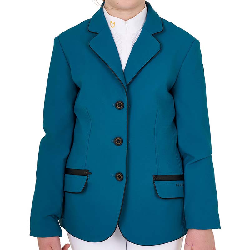 • Equestro Turnierjacke für Mädchen und junge Reiterinnen mit klassischem Dreiknopf-Design, gefertigt aus atmungsaktivem, wasserabweisendem Funktionsgewebe, ideal für Wettbewerbe im englischen Reitstil.